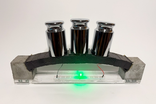 Image: An electron-conducting carbon concrete (ec³)-based arch structure integrates supercapacitor electrodes for dual functionality. The prototype demonstrates both structural load bearing and the ability to power an LED, with the light’s intensity varying under applied load, highlighting the potential for real-time structural health monitoring via the supercapacitor. (Credits:Image courtesy of the MIT EC³ Hub)