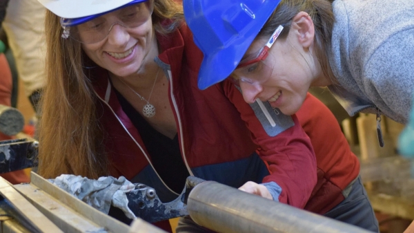 Image: Prof. Dr. Gisela Winkler (left), Columbia Climate School, Columbia University (New York/USA) and Prof. Dr. Julia Gottschalk, Institute of Geosciences at Kiel University, examine a sediment core obtained during IODP Expedition 383 with the JOIDES Resolution. (Credit: © Tim Fulton)