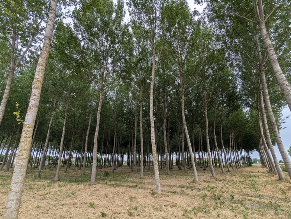 Windswept hybrid poplar plantation surrounded by a cornfield in the Vento region of Italy. (Photo Credit: David MacFarlane)